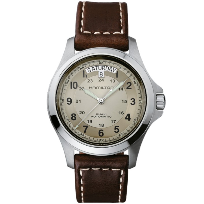 冒険心を刺激するハミルトン「カーキ フィールド キング オート」。高精度な自動巻きH-40ムーブメントとデイデイト表示を搭載。タフな40mmケースは日常からアウトドアまで、あらゆる挑戦に寄り添います。