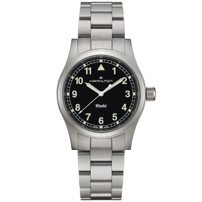 ハミルトン・カーキフィールド・クオーツ38mm。信頼性の高いクオーツムーブメントと堅牢なデザインが、あらゆる冒険をサポートします。視認性抜群のブラックダイヤルで、シンプルかつ実用的なフィールドウォッチの決定版。