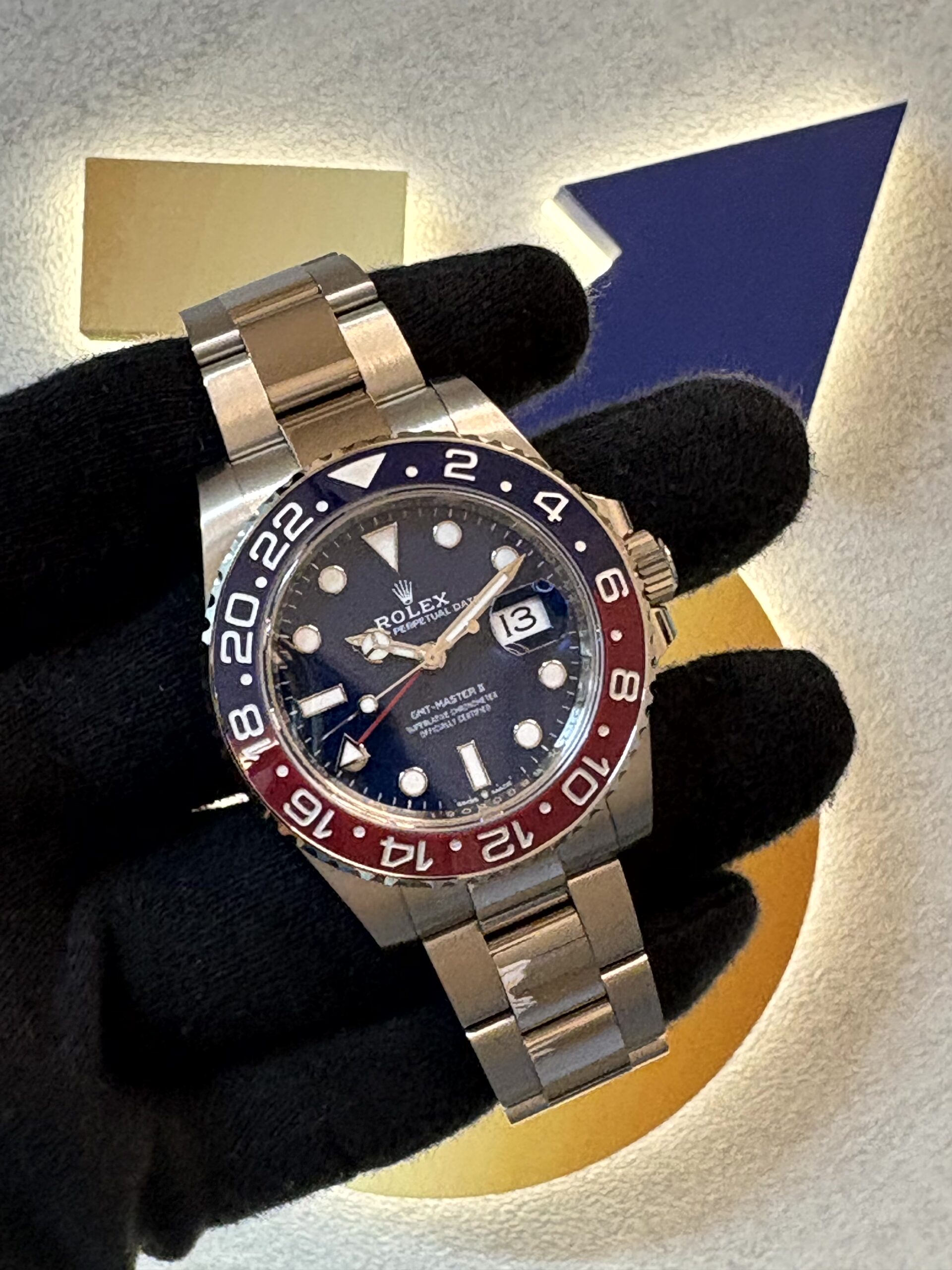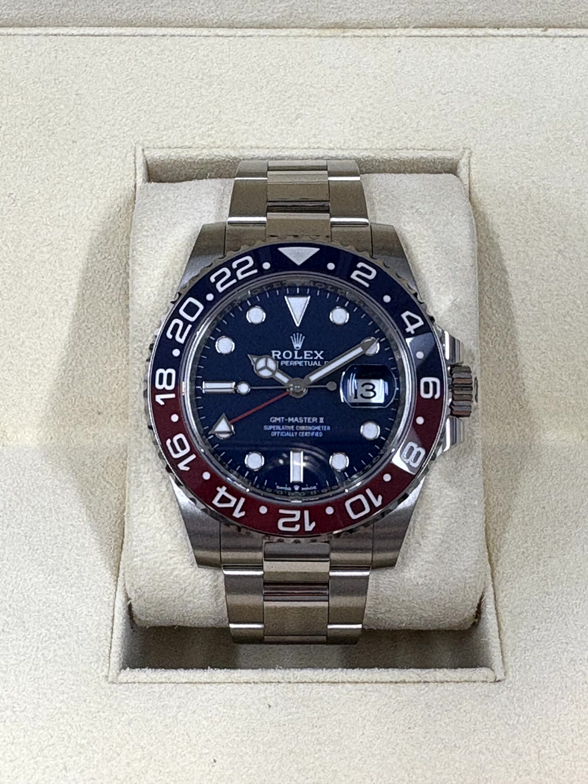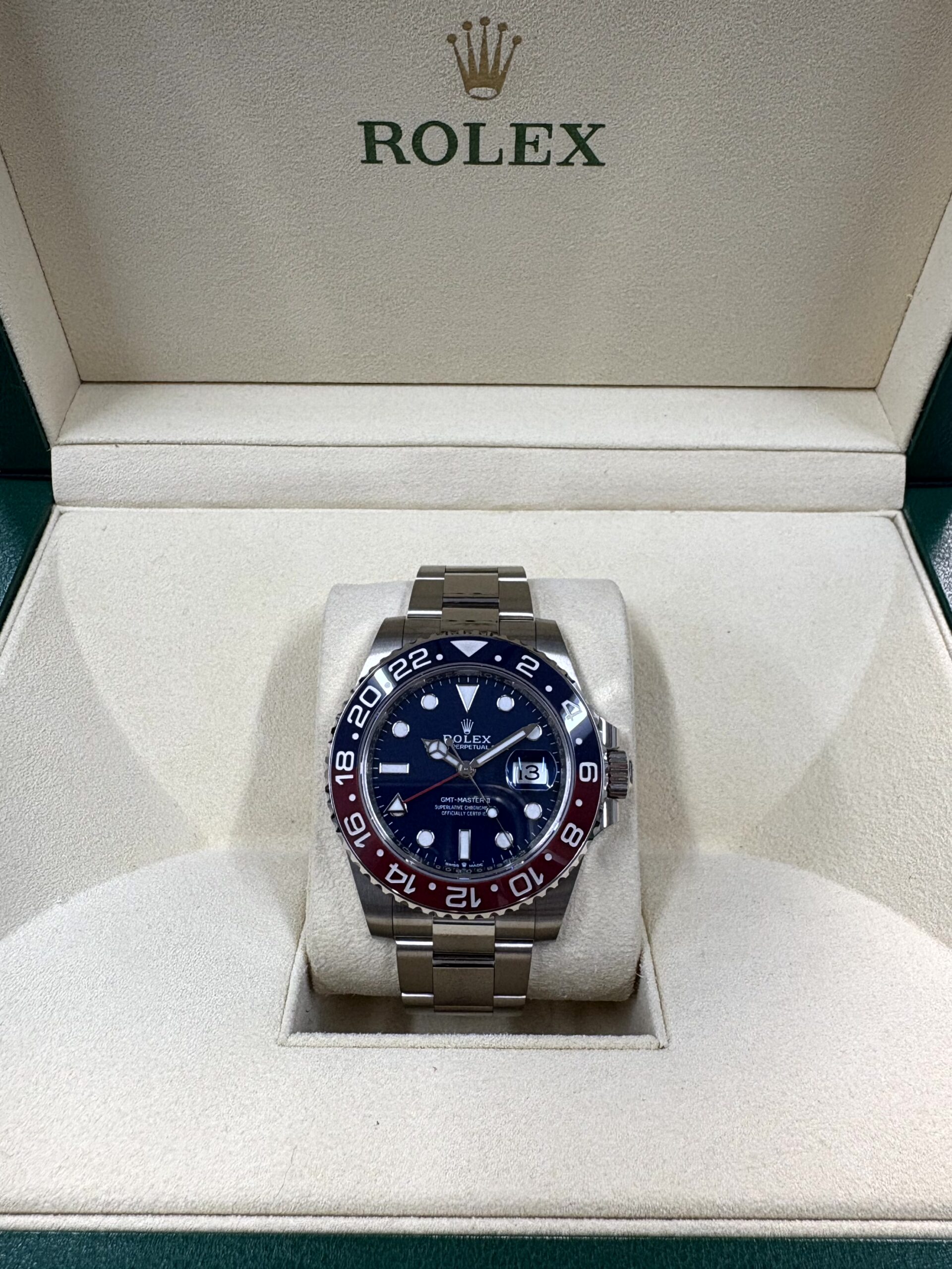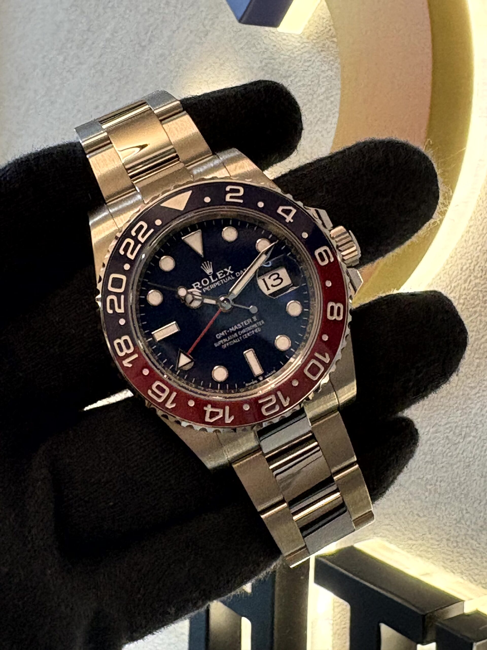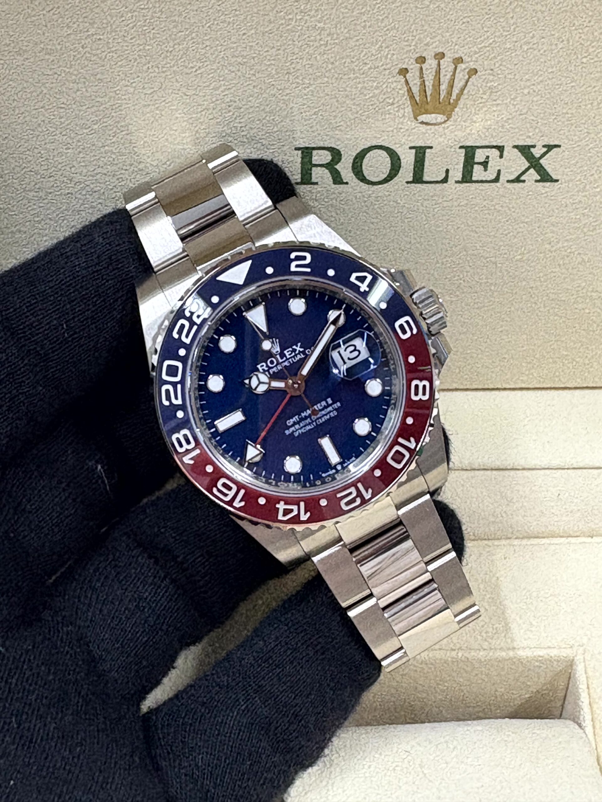 ベゼルは、青と赤のセラクロム(ペプシカラー)が両方向に回転する24時間目盛りを備えており、最大で3つのタイムゾーンを同時に表示できる実用的な機能を搭載しています。ムーブメントには、ロレックスが完全自社開発した高精度なキャリバー3285が搭載されており、約70時間のパワーリザーブと、日差−2〜+2秒という卓越した精度を誇ります。ホワイトゴールドの重厚感とメテオライトダイアルの神秘性が融合した、まさにロレックスの技術と美意識が凝縮されたタイムピースであります。この時計は、機能性とデザイン性を高次元で両立しており、世界を飛び回る現代の探検家にとって理想的な選択となるでしょう。