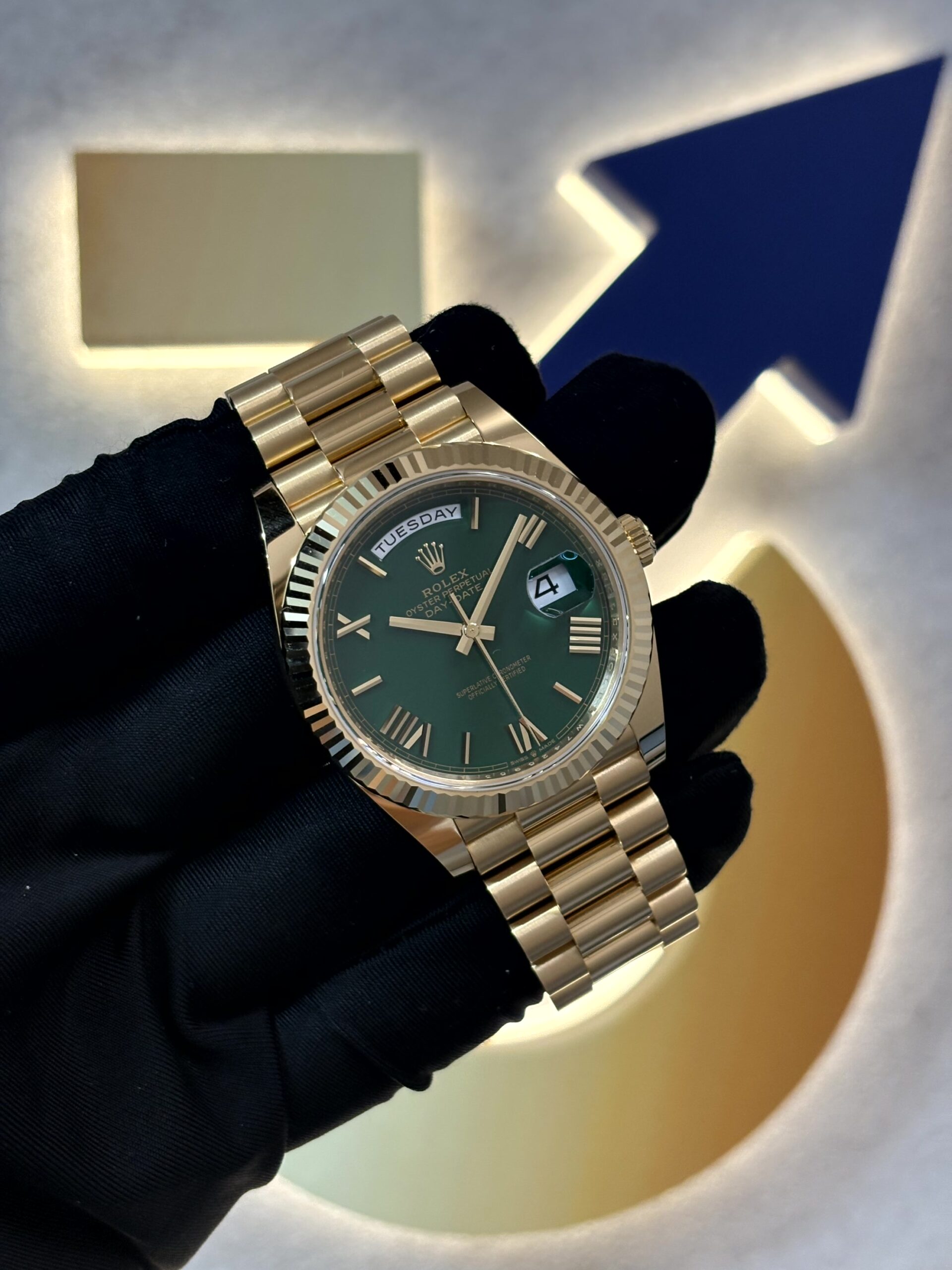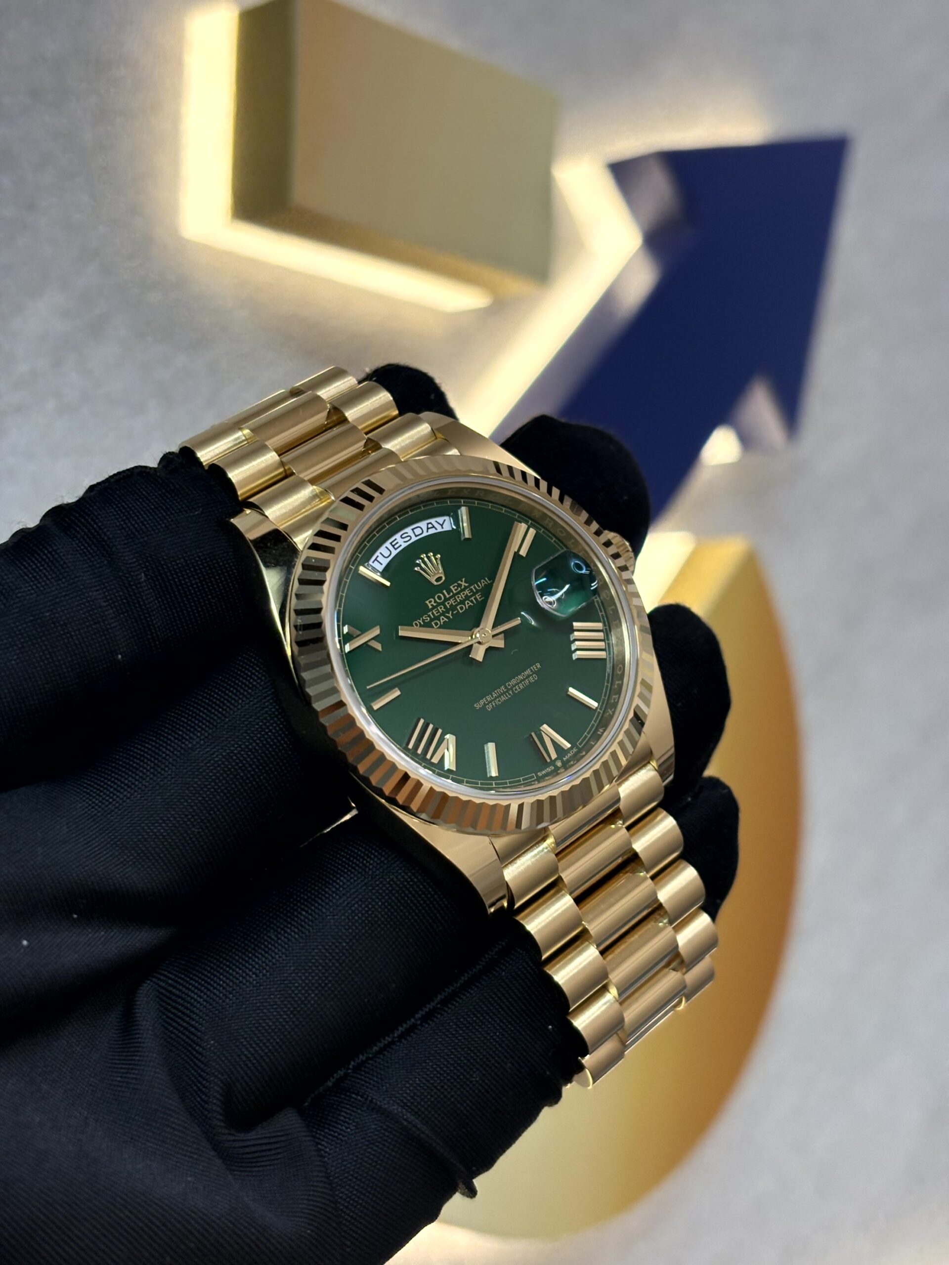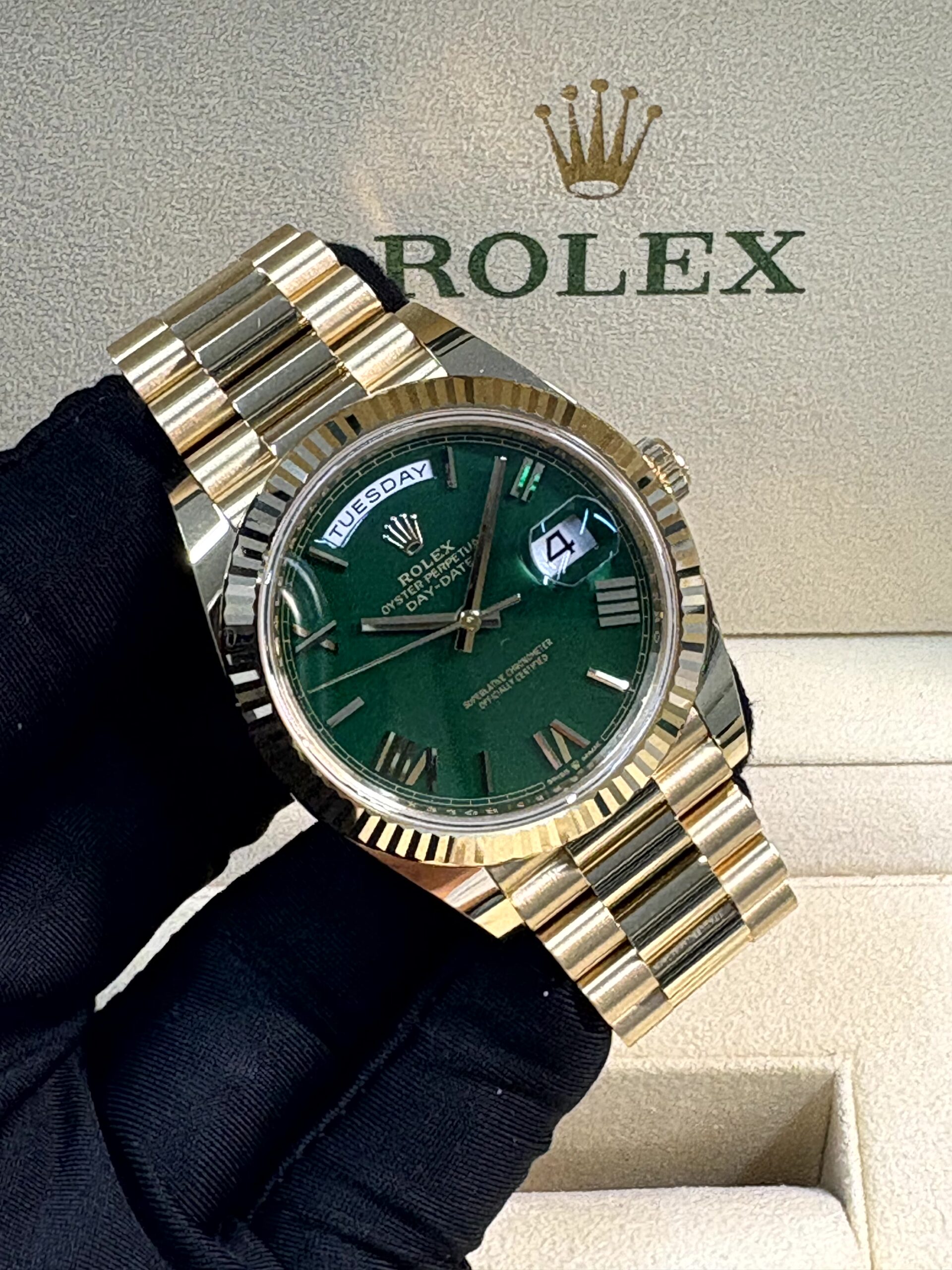 デイデイト 40は、ロレックスのトップレンジに位置づけられるモデルであり、その仕上げの細部に至るまで妥協がありません。フルーテッドベゼルは光を反射し、イエローゴールドの輝きを一層際立たせています。装着感に優れるプレジデントブレスレットは、半円形の三連リンクで構成されており、見た目の美しさと快適な着用感を両立しています。