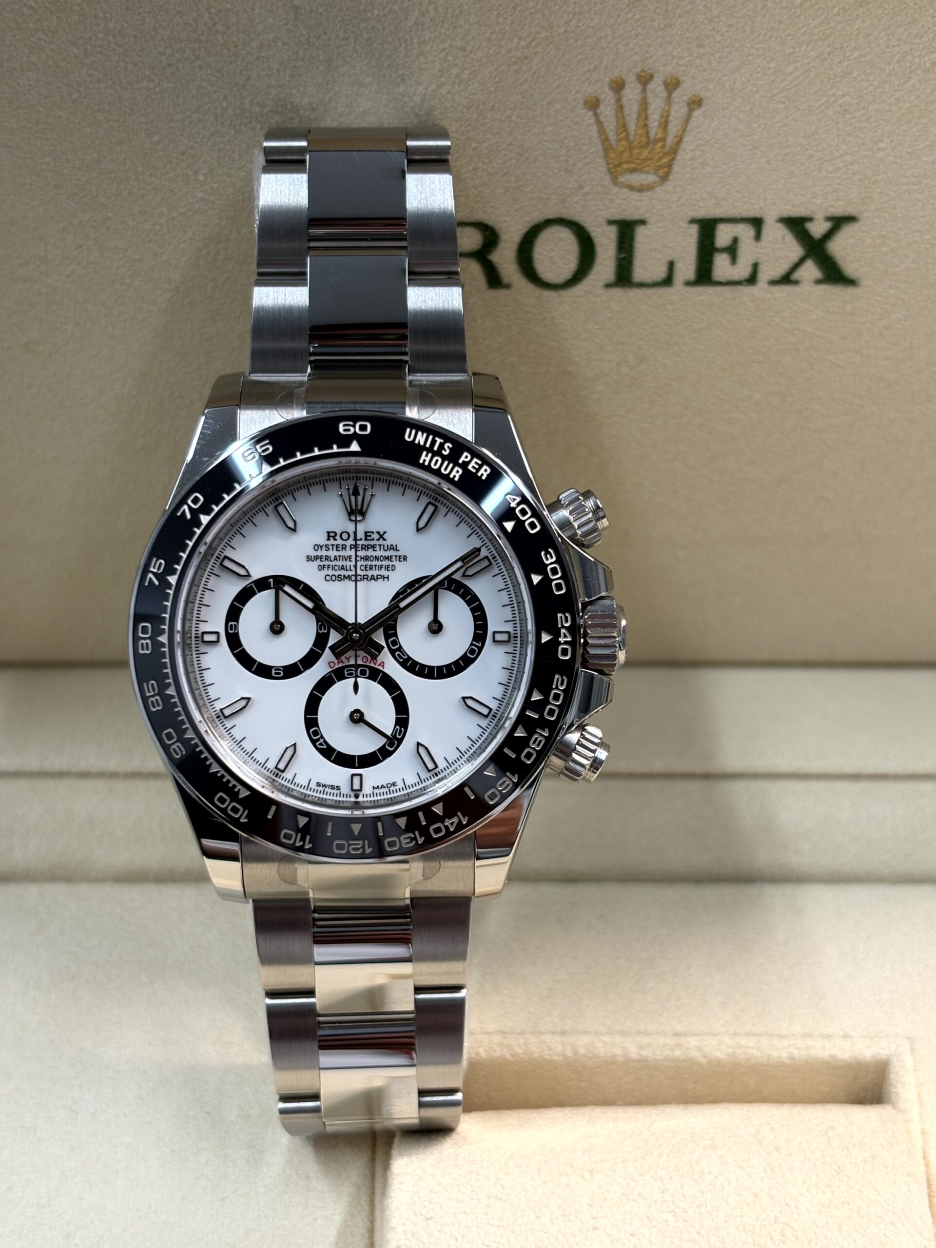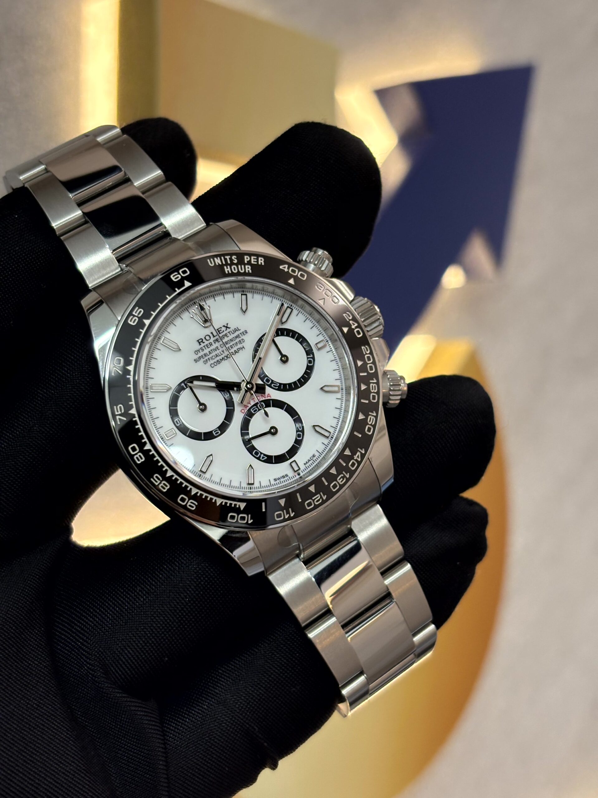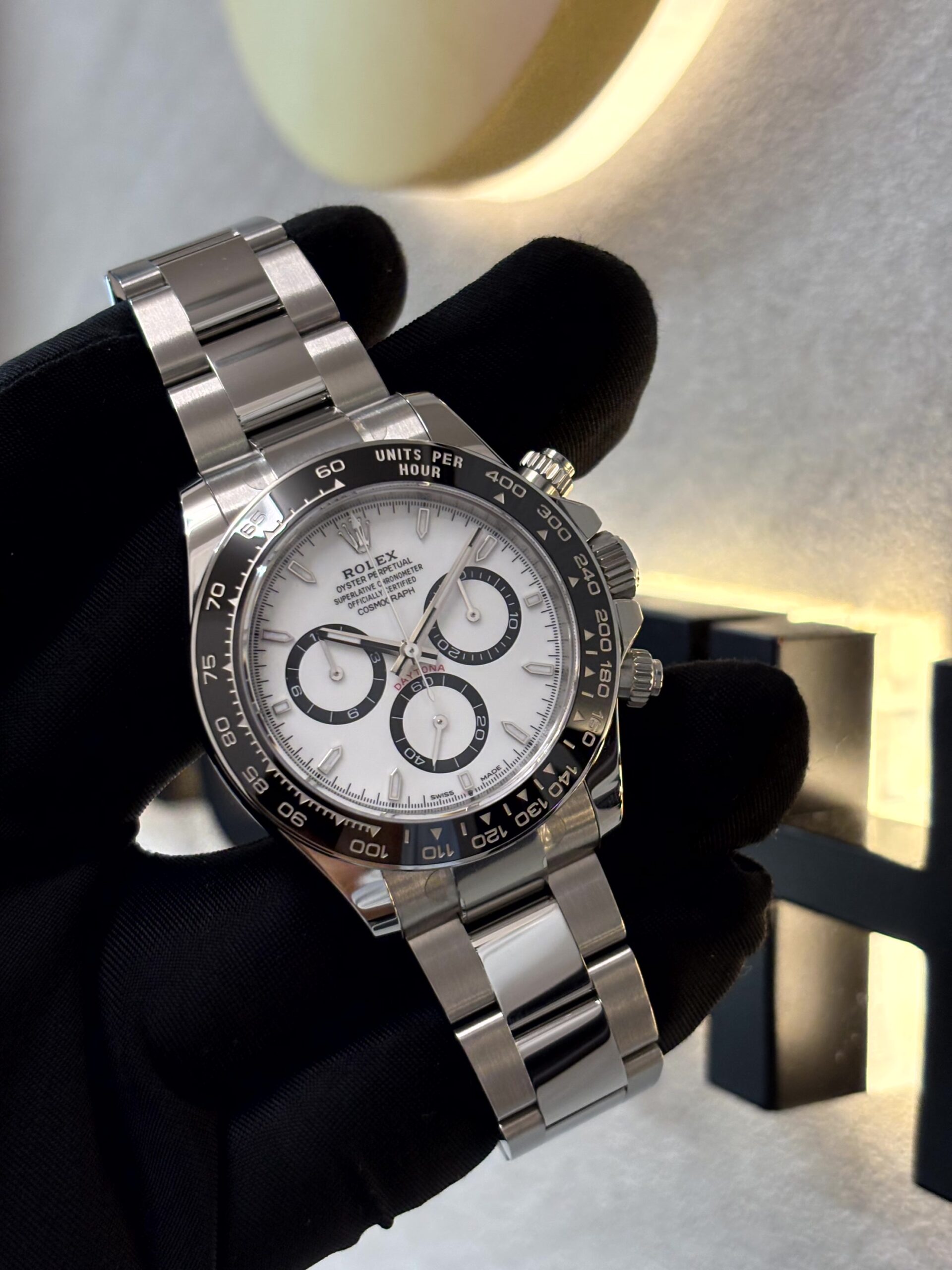 ステンレススチール製のオイスターケースとブレスレットは堅牢性に優れており、日常使いはもちろん、あらゆるシーンでその存在感を際立たせます。特に、鮮やかなホワイトダイヤルにブラックのインダイヤルが配されたデザインは、高い視認性とモダンな美しさを両立させています。ロレックスの技術の粋を集めたこのタイムピースは、単なる時間を知るための道具ではなく、持つ人のステータスと情熱を表現する究極のアイテムとなるでしょう。その精緻な作り込みと時代を超越した魅力は、末永く愛用していただけることをお約束します。