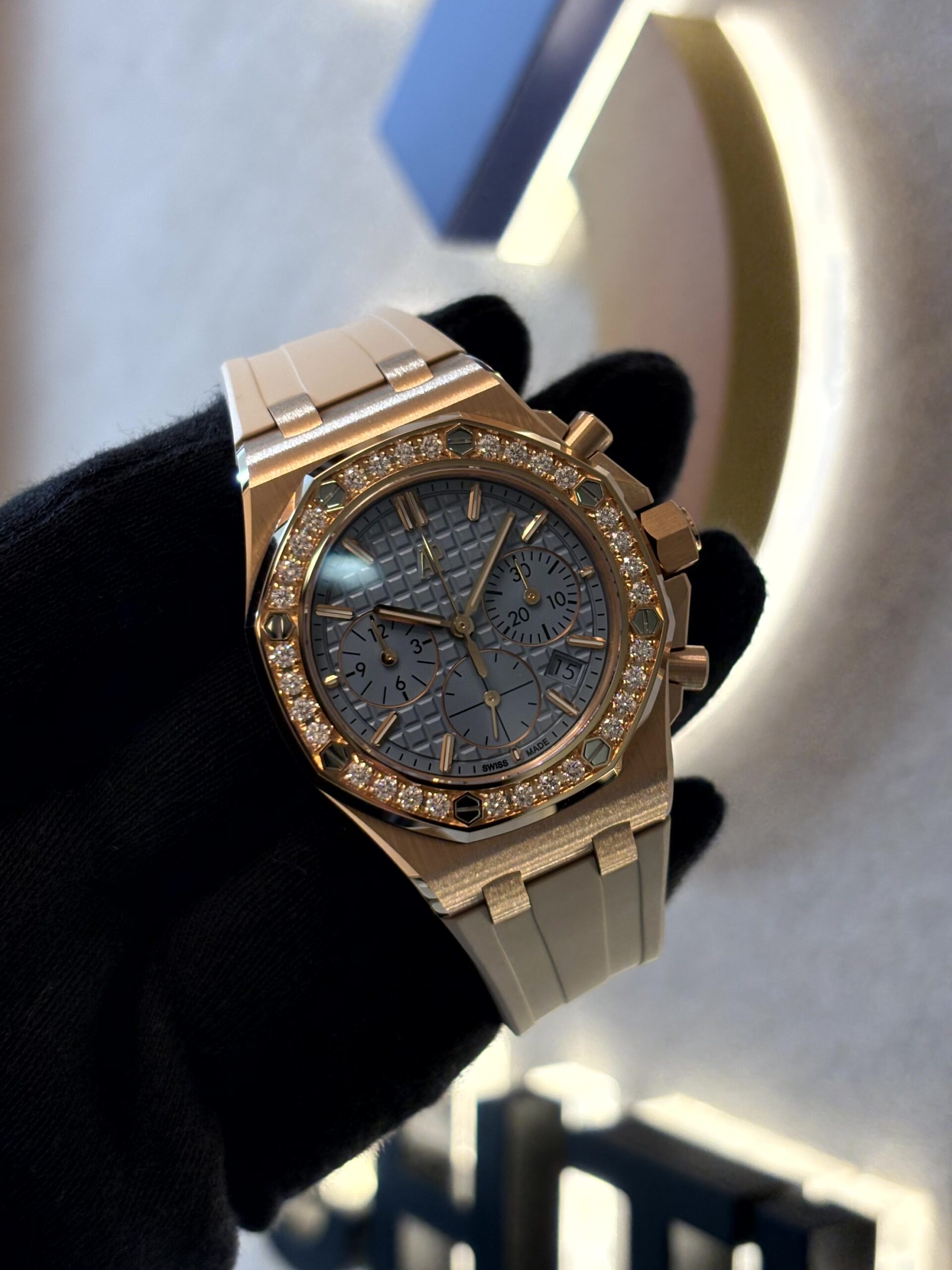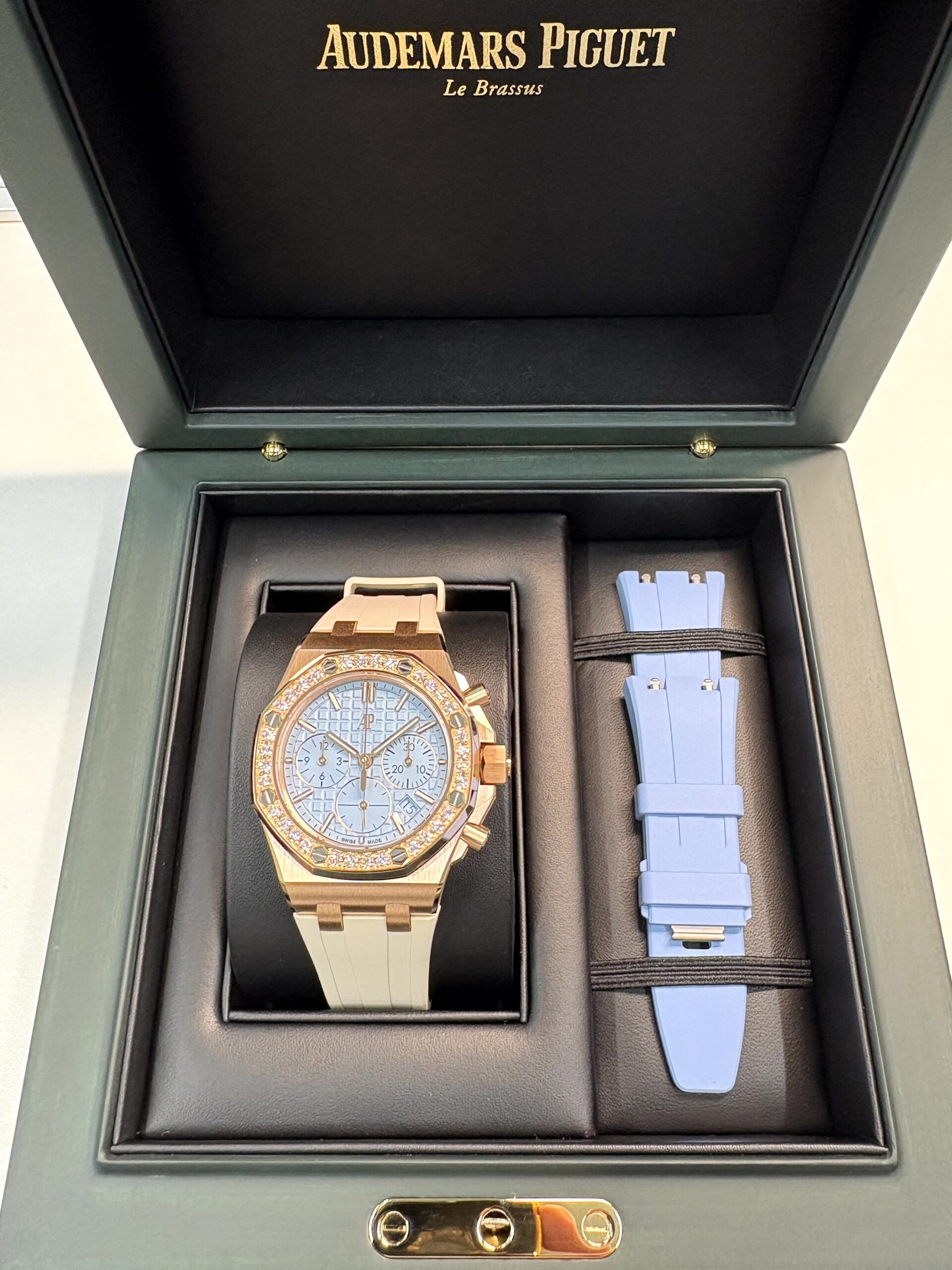 ダイアルデザインは、光沢のあるライトブルーの「レディ タペストリー」パターンが採用されており、非常にエレガントで上品な印象を与えます。この繊細なタペストリー模様が光の加減によって表情を変え、見る人を飽きさせません。ダイアル上のカウンターはブルーで統一され、インデックスにはピンクゴールド製のアプライド アワーマーカーが配置されており、ロイヤル オーク特有の針にも夜光塗料が施されているため、暗所での視認性も確保されています。これらのディテールが、全体のデザインに深みと洗練さを加えています。