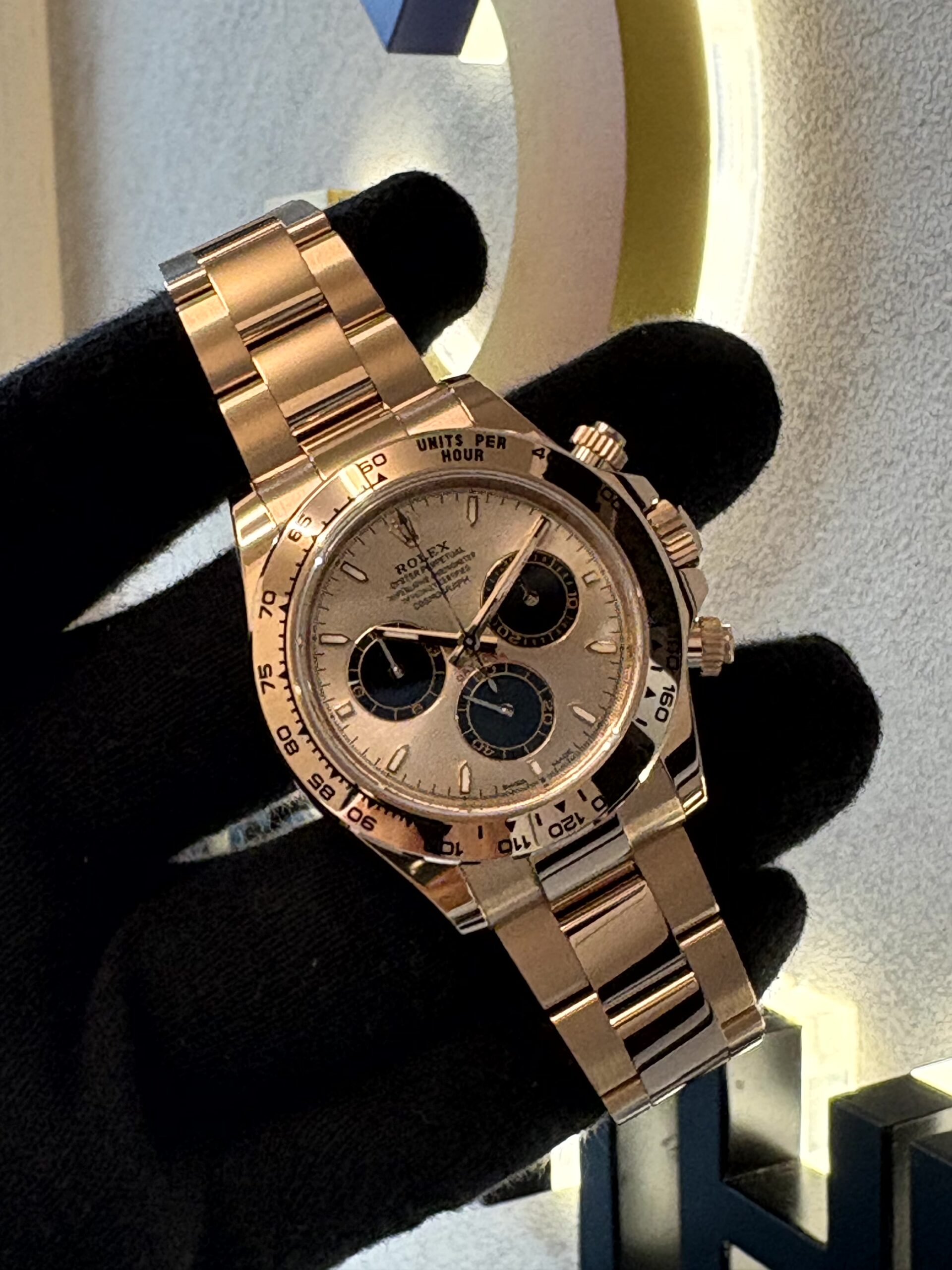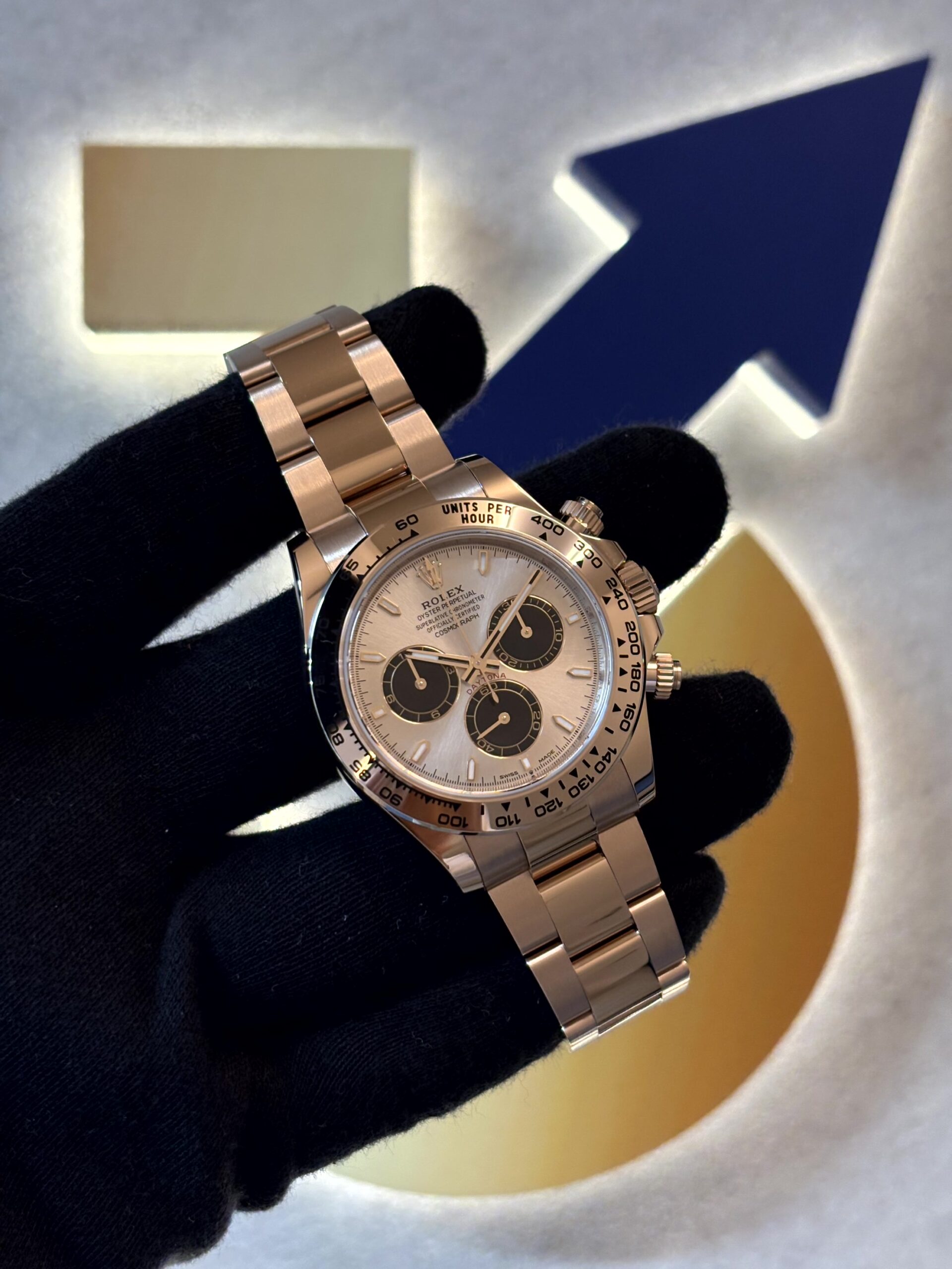 素材には、ロレックス独自の配合によって生み出されたエバーローズゴールドが採用されています。エバーローズゴールドは、通常のピンクゴールドと比較して、その美しいピンクの色調が永続的に保たれるように設計されており、時を経ても変わらない輝きを放ち続けます。ケースとブレスレット全体にこの素材が惜しみなく使用されることで、時計全体から漂うオーラは非常に豪華でエレガントです。