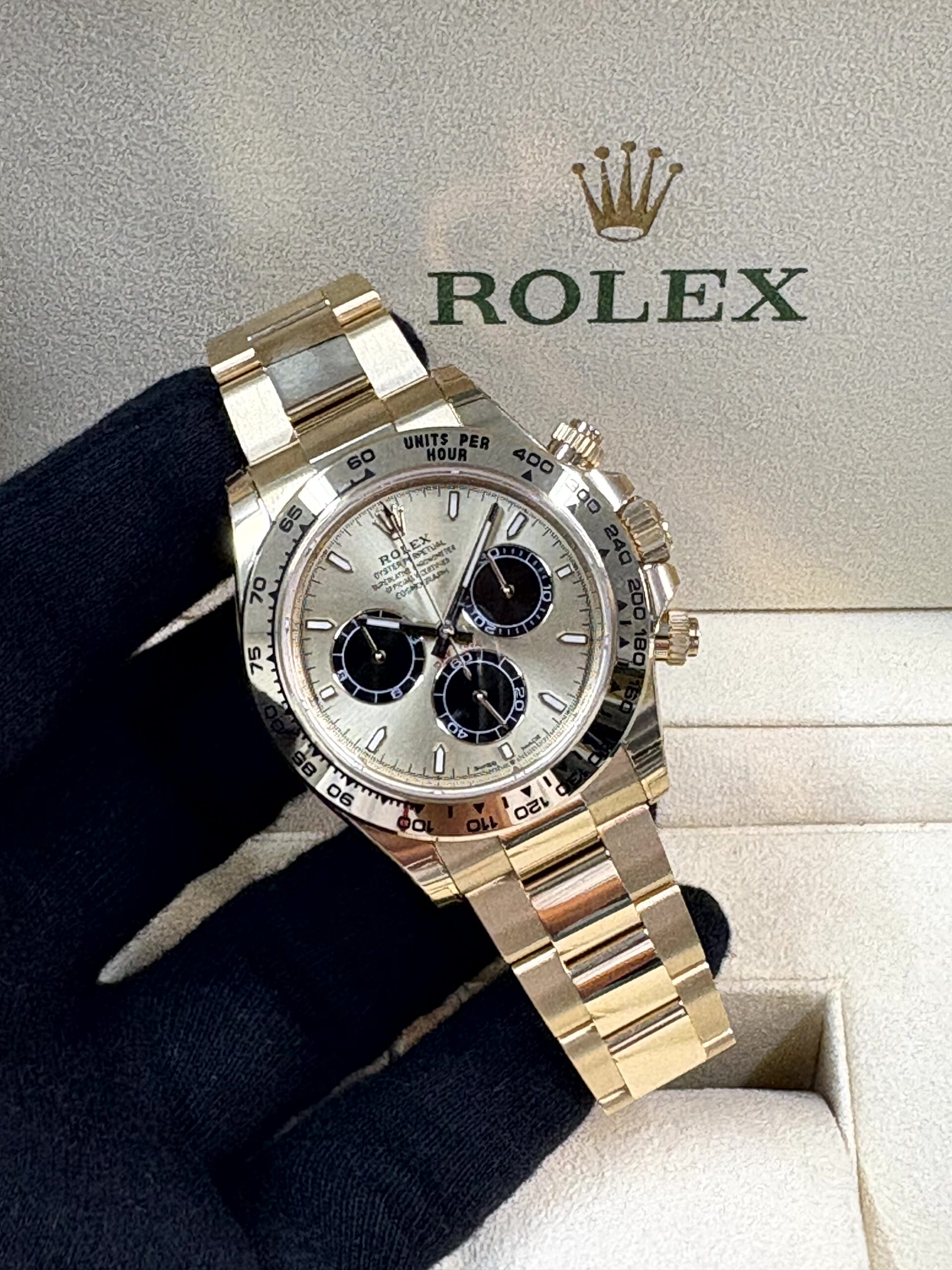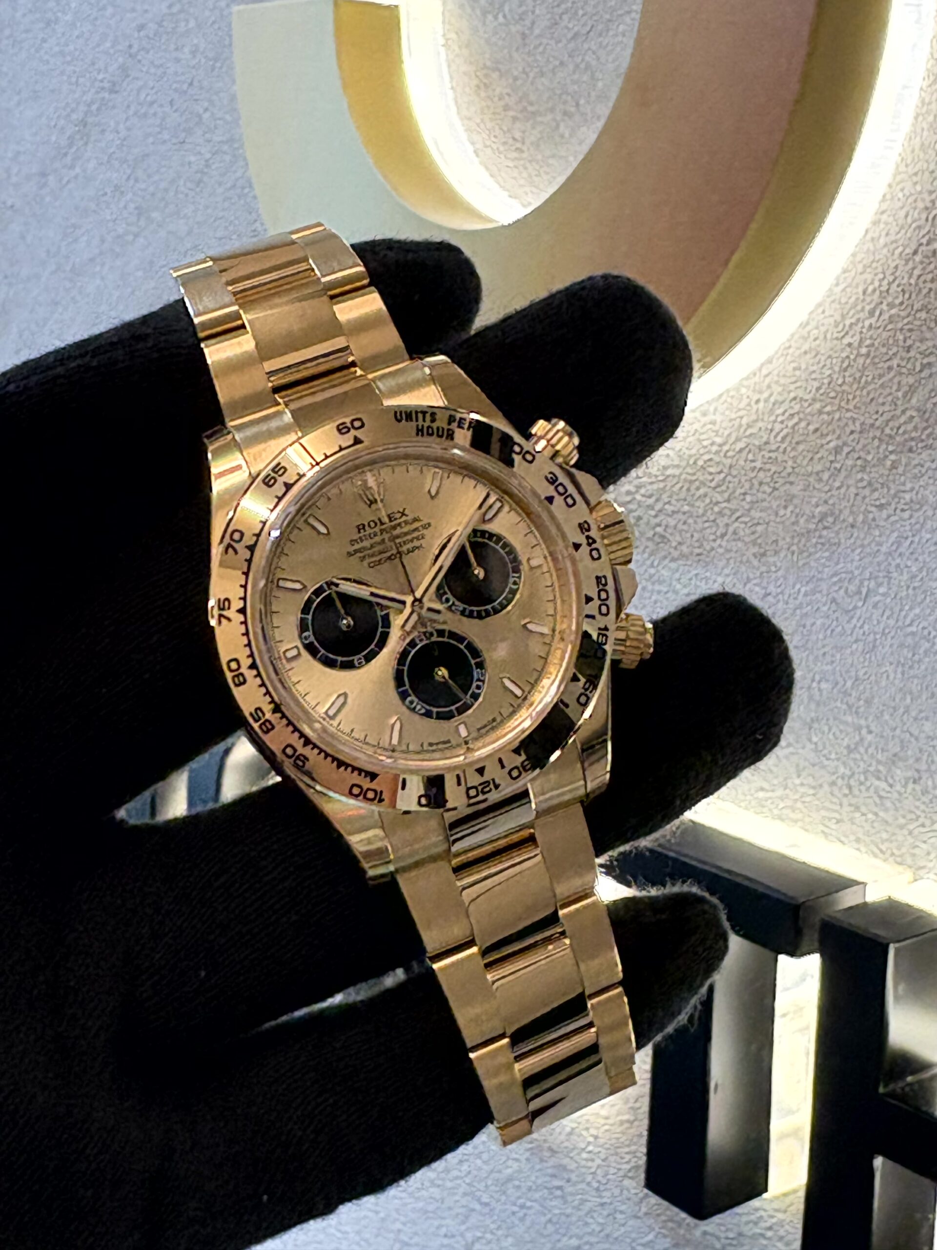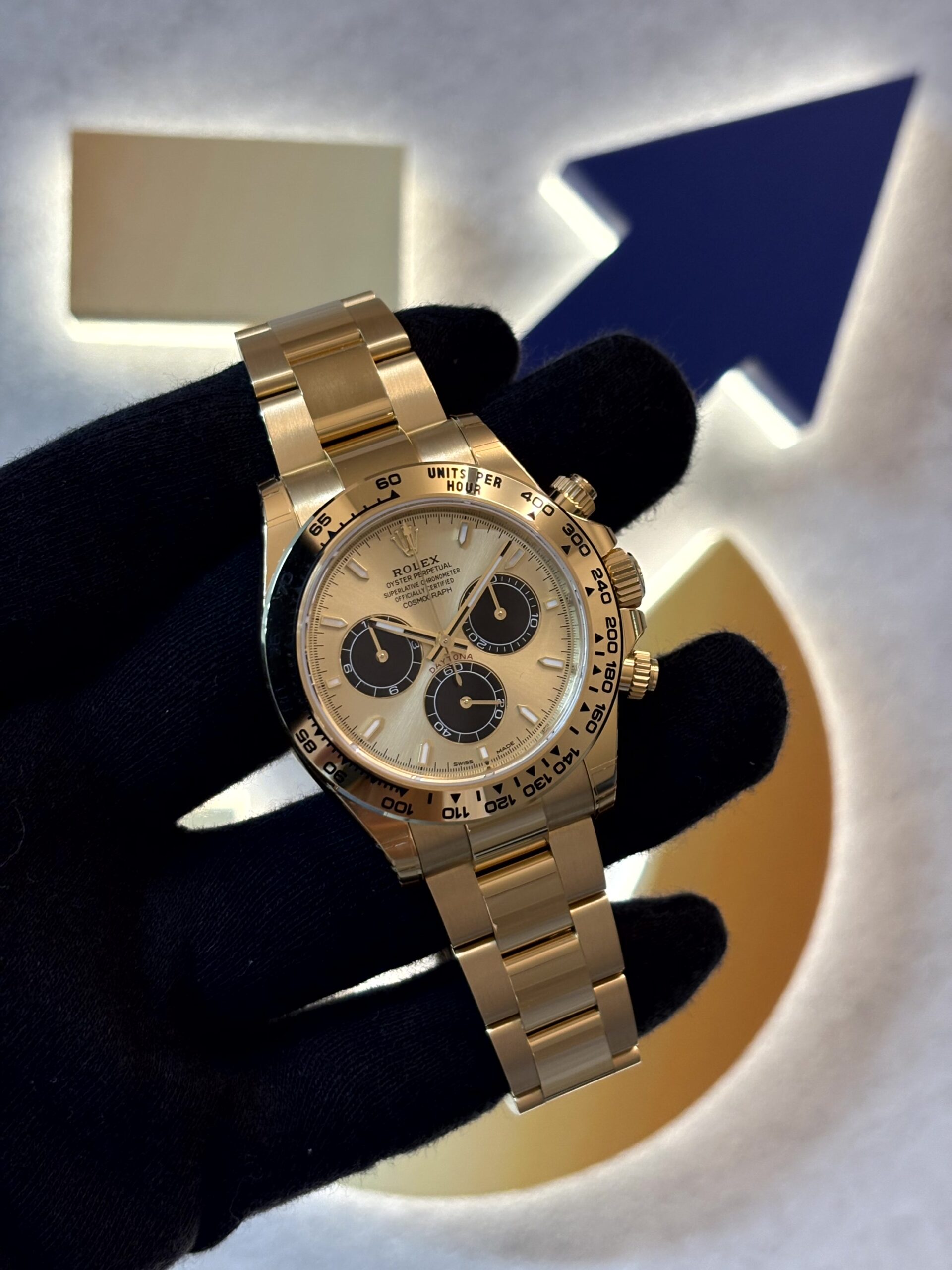 お客様がご覧になっているのは、高級時計ブランドの最高峰に位置するロレックスが誇る「コスモグラフ デイトナ」コレクションの中でも、特に目を引くイエローゴールドモデル、リファレンス126508です。この時計は、モータースポーツの世界と深く結びついたデイトナの伝説的な歴史を継承しつつ、現代の技術と洗練されたデザインが融合した逸品となっています。