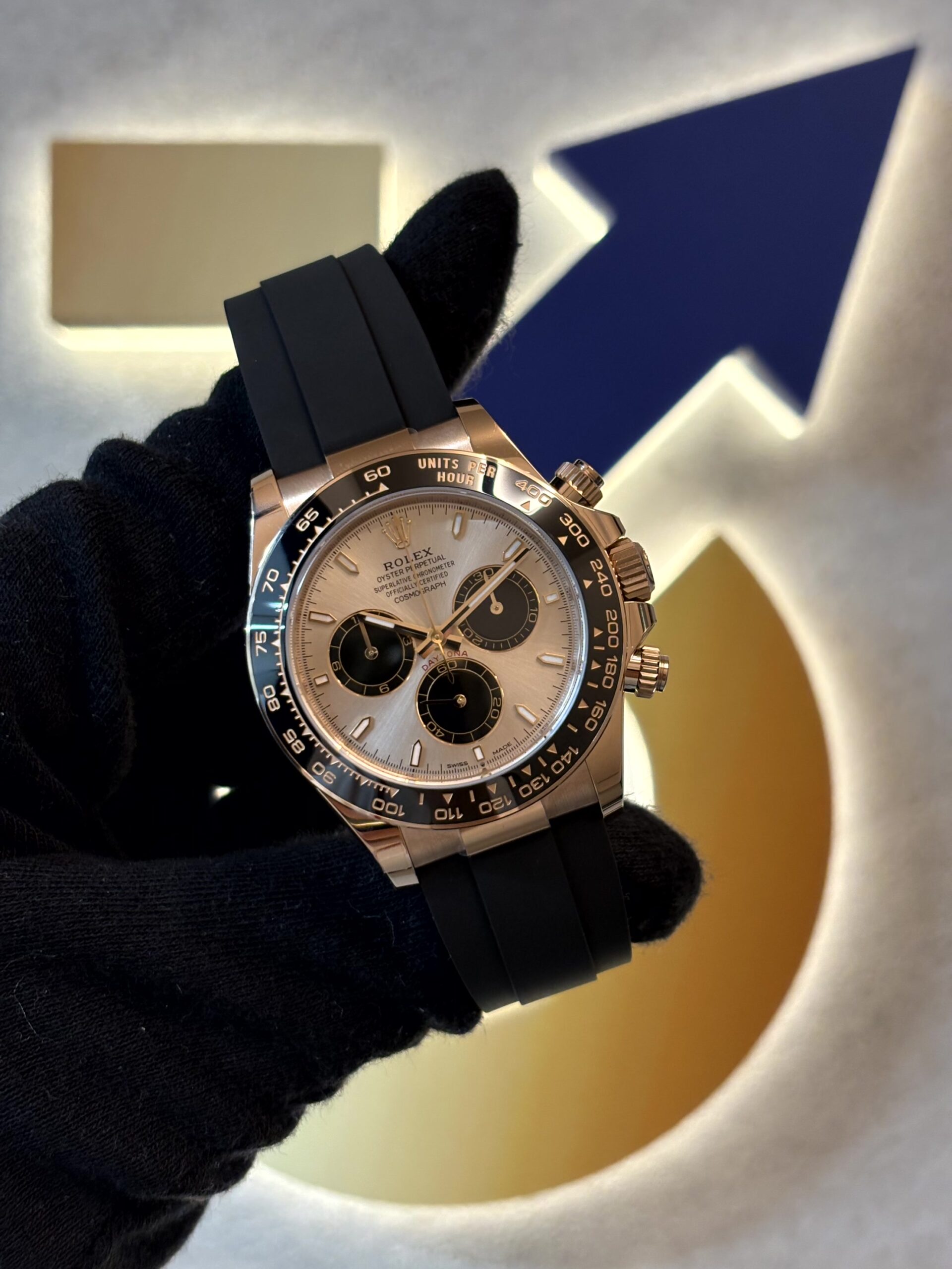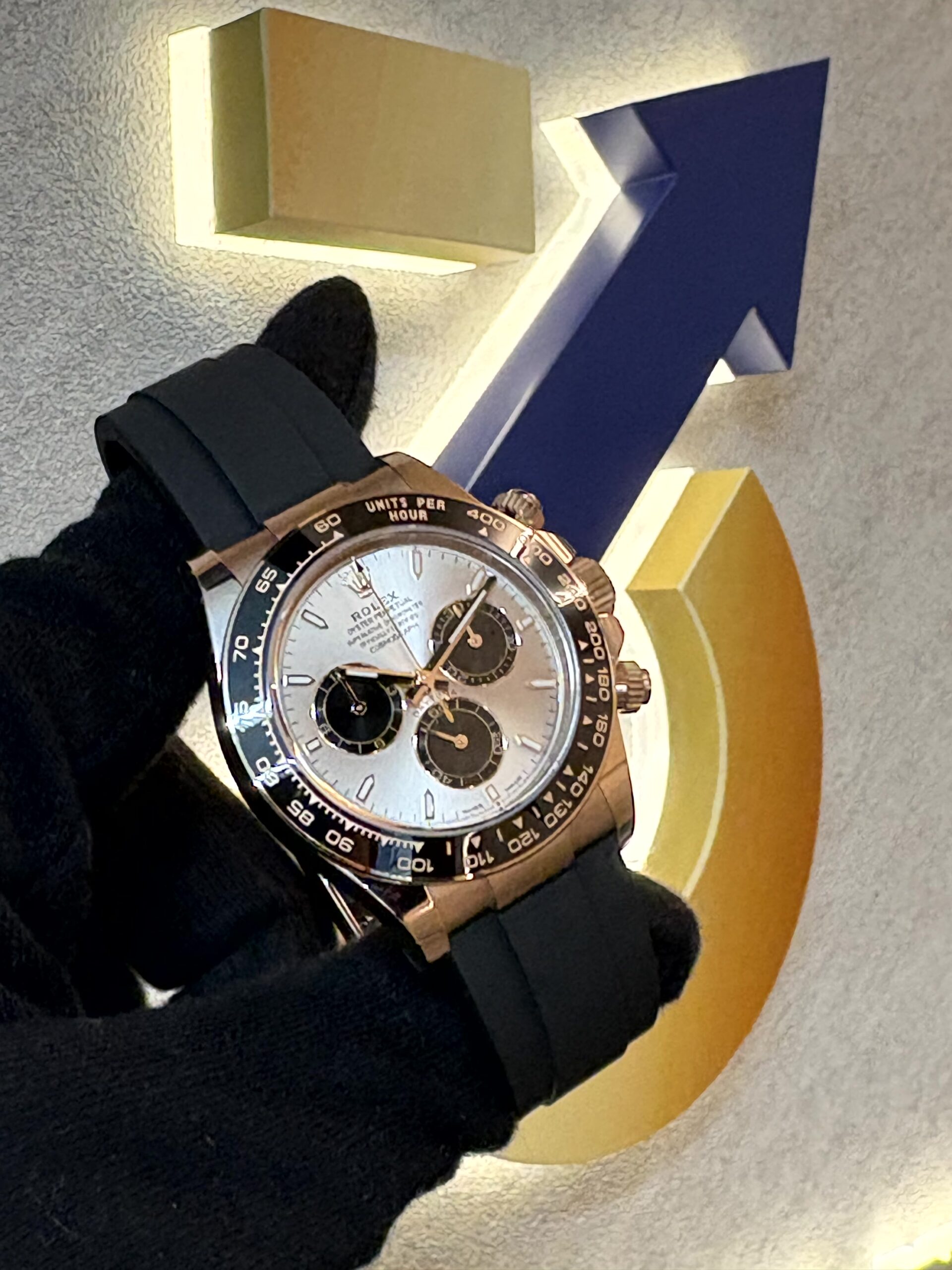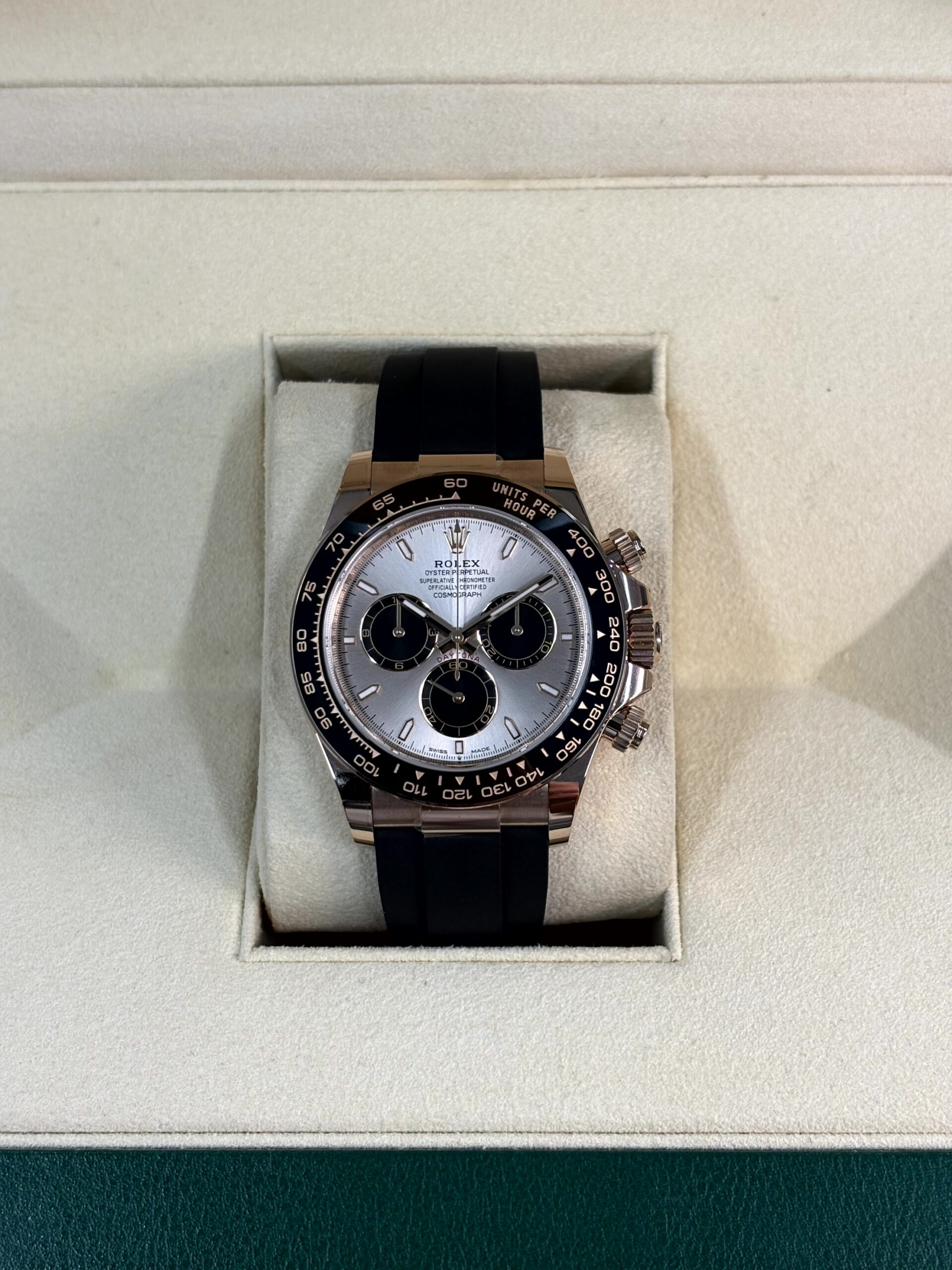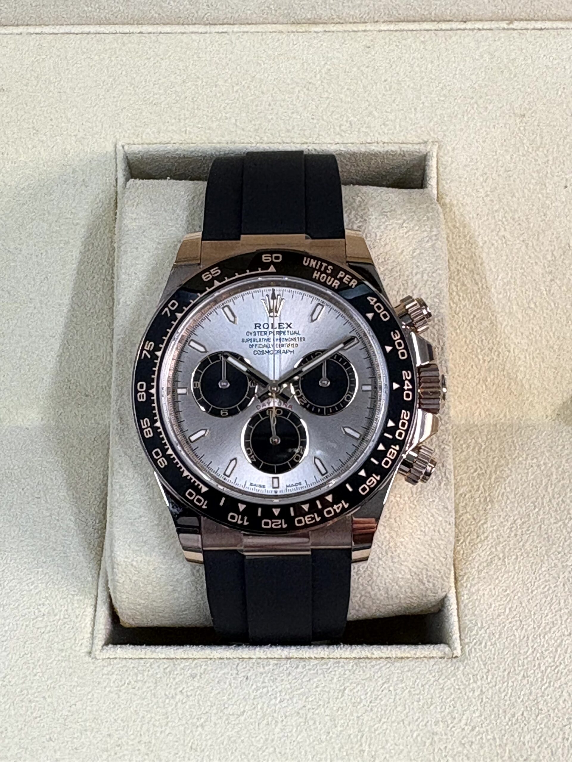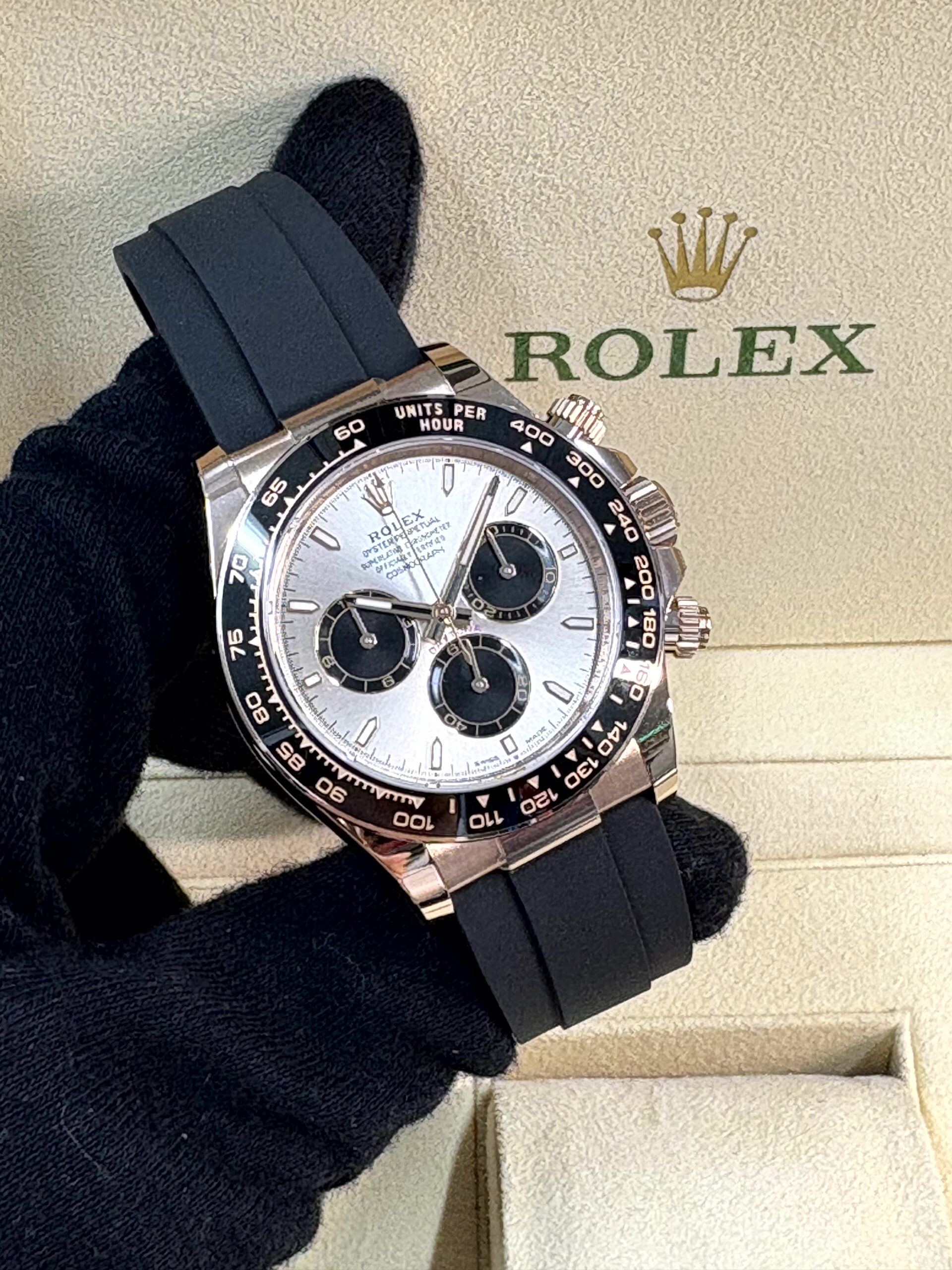 このモデルのもう一つの特徴は、高性能なブラックのオイスターフレックス ブレスレットです。これは柔軟なメタルブレードをエラストマーで覆ったもので、スポーティーでありながら非常に快適な装着感を提供します。セラミック製のタキメーターベゼルは、耐久性と視認性を両立しており、クロノグラフ機能と合わせて、まさに完璧なレーシングウォッチとしての資質を備えています。
