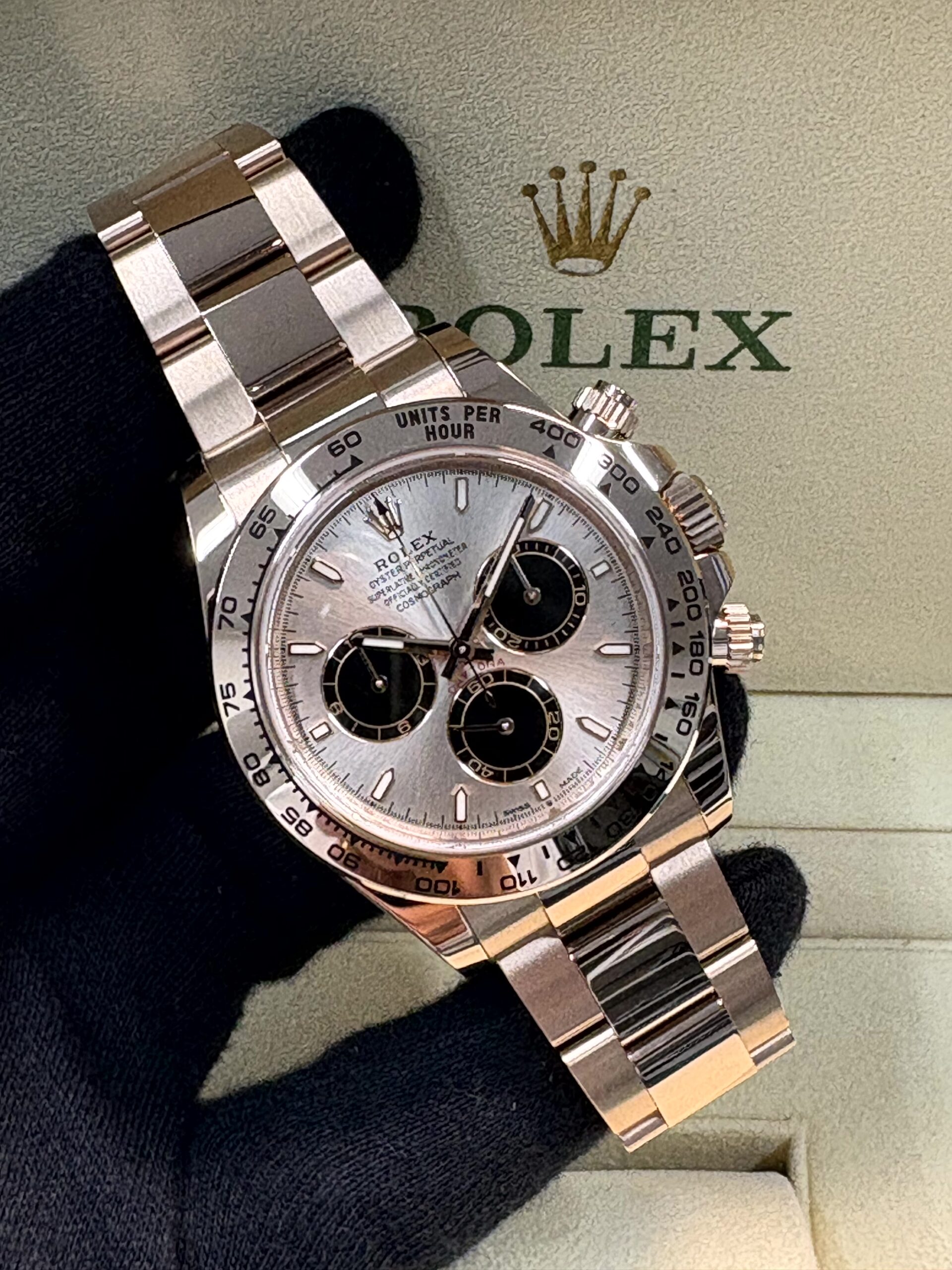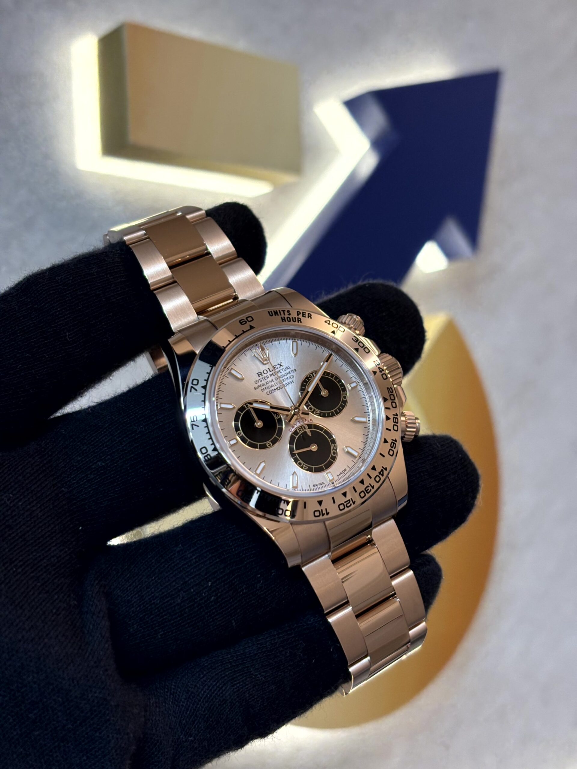 18Kエバーローズゴールドのケースは、ロレックス独自の配合により、時間が経過しても変わることのない美しい輝きを放ち続けます。この温かみのあるピンクゴールドが、手首に装着した際に格別な存在感を与え、所有者のステータスを静かに主張します。ベゼルには、耐傷性に優れたブラックのセラクロムが採用されており、タキメータースケールが刻印されています。これにより、レースの計時というデイトナのルーツを想起させると同時に、スポーティーかつ洗練されたコントラストを生み出しています。