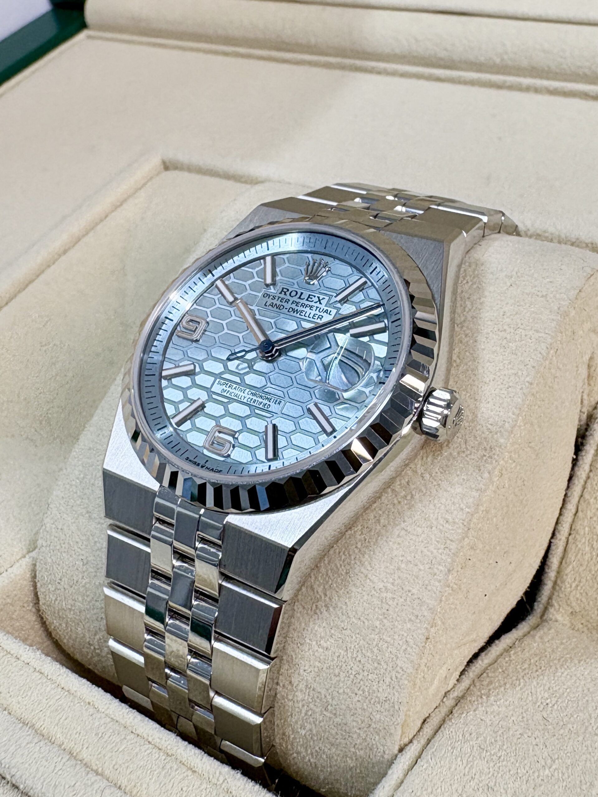 ロレックス ランドドゥエラー Ref.127236は、プラチナ950製ケースにフルーテッドベゼルを備えた最新世代モデルです。重厚感あふれるプラチナ特有の輝きと洗練されたデザインが融合し、卓越した存在感を放ちます。本商品は未使用品・フルセットで、コレクションや資産保有としてもおすすめできるコンディション良好な一本です。ケース径36mm、100m防水を備え、実用性とステータス性を兼ね備えたロレックスの新たな象徴的モデルです。