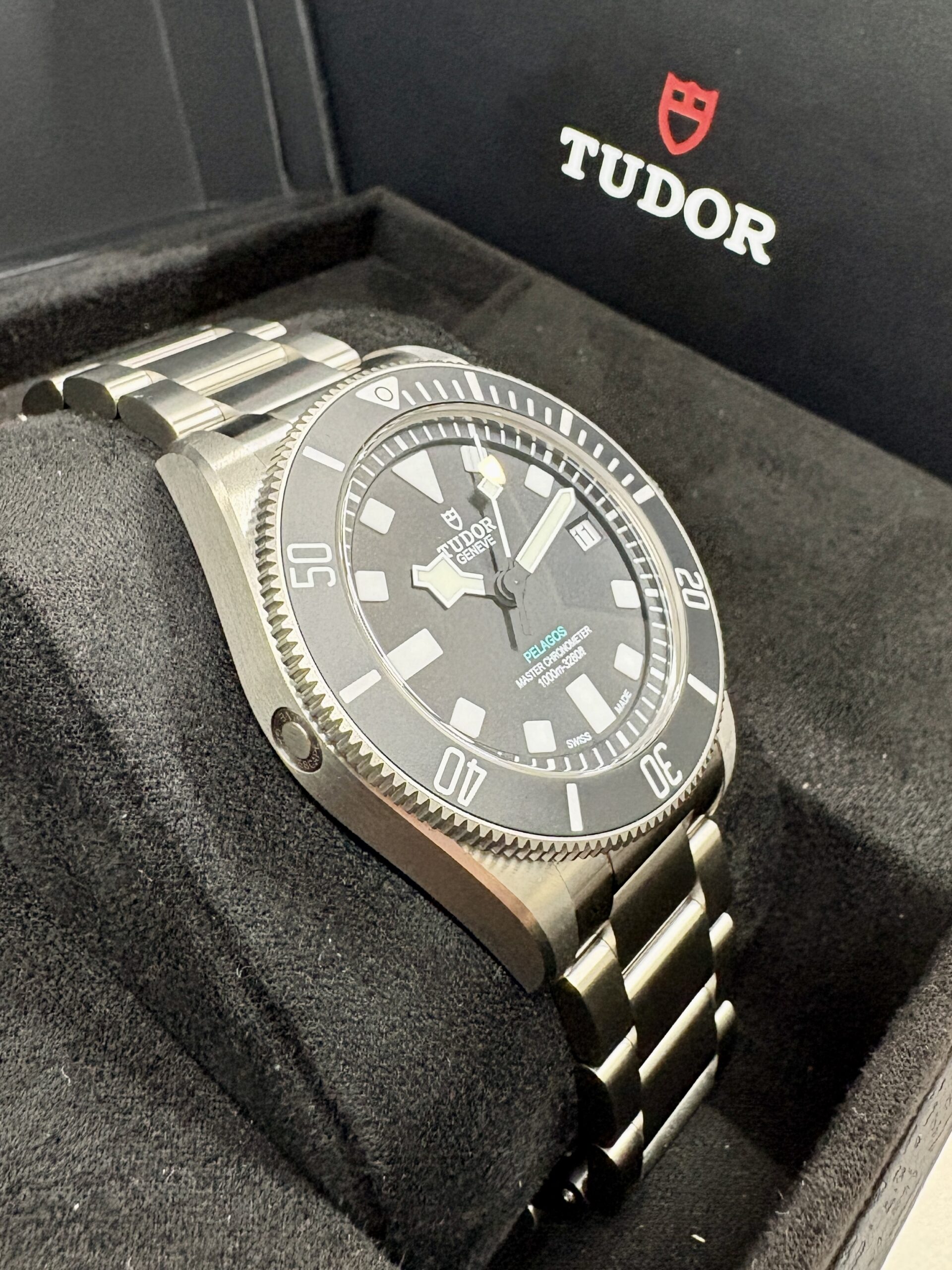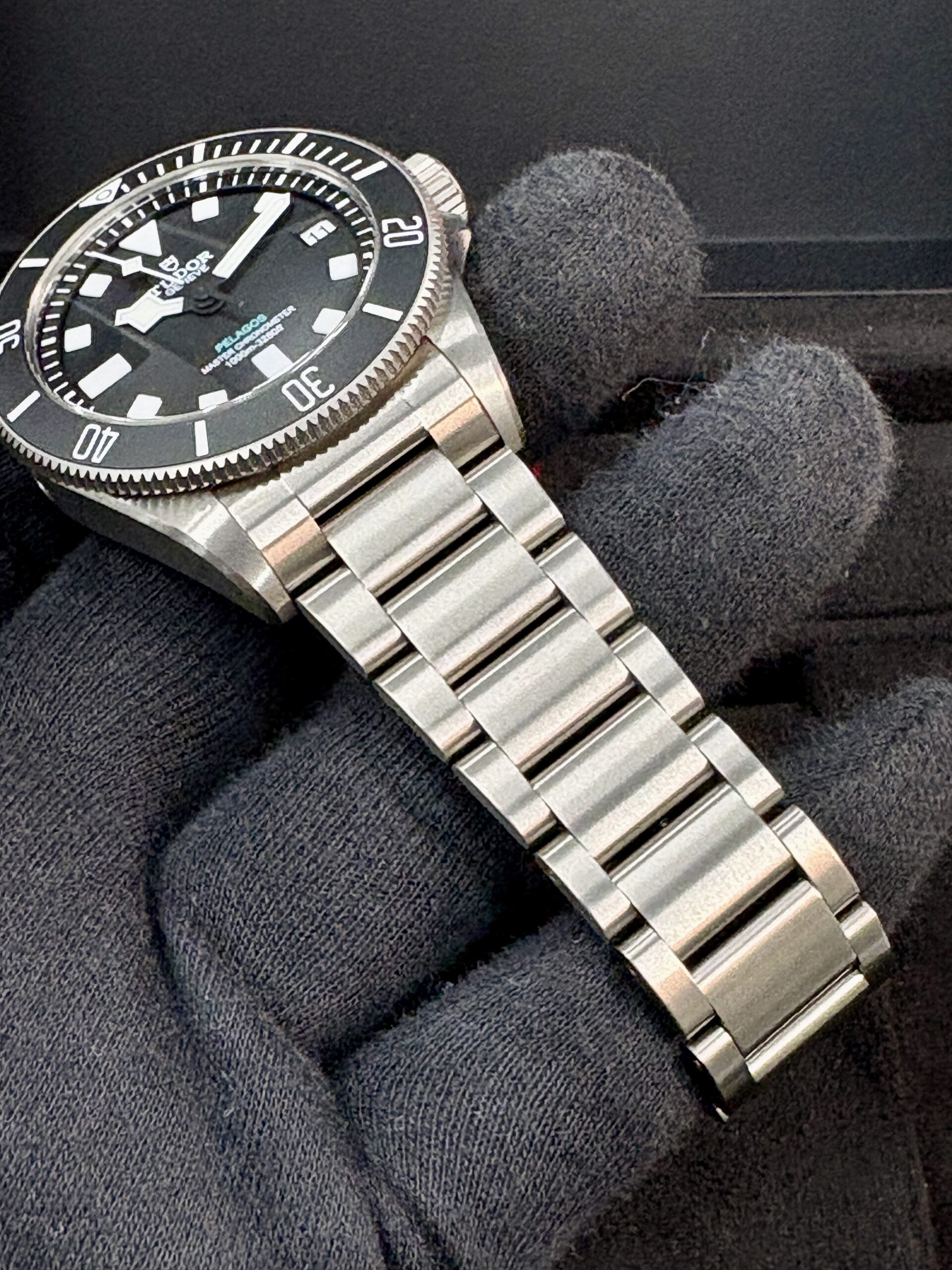 チューダーの本格プロフェッショナルダイバーズ「ペラゴス ウルトラ Ref.2543C1A7NU」。軽量かつ高強度なチタン製43mmケースを採用し、シリーズ最高峰クラスとなる1,000m防水性能を備えたハイスペックモデルです。逆回転防止ベゼルやヘリウムエスケープバルブを装備し、飽和潜水にも対応する本格仕様となっています。
